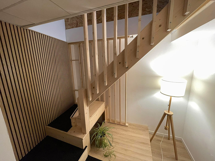 Une entrée chaleureuse avec escalier en bois et garde-corps moderne qui mène à 2 espaces séparés mais ouverts pour plus de convivialité. Mobilier modulable et fonctionnel. Un espace kitchenette et coin wc.