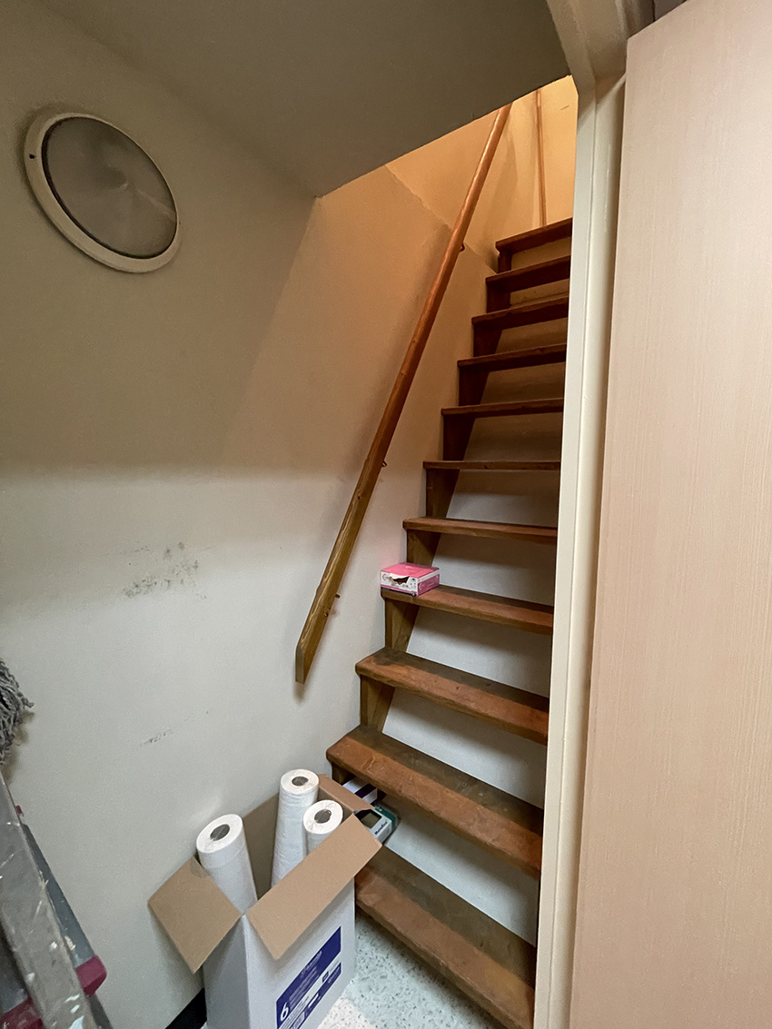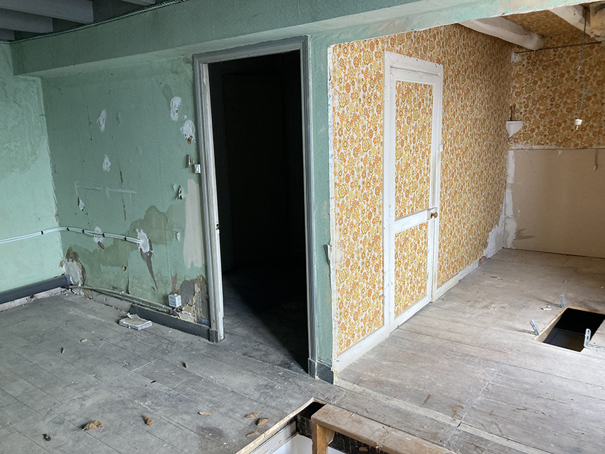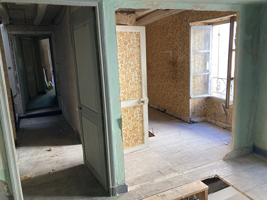 L'étage n'était pas aménagé (ou alors il y a fort longtemps vu le look des tapisseries !). L'accès se faisait via un escalier de meunier depuis l'espace cuisine du rdc.