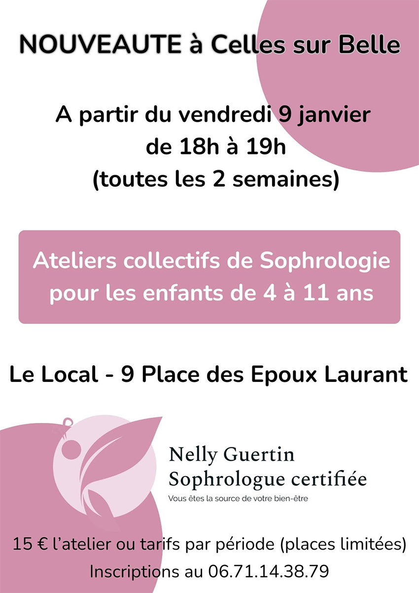 A partir de janvier 2026, Nelly Guertin, sophrologue certifiée, propose ses ateliers de sophrologie pour enfants et adultes au RDC de LE LOCAL , 9 place des Epoux Laurant à Celles-sur-Belle
