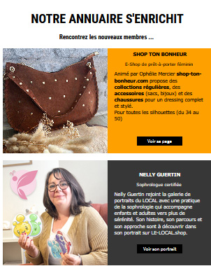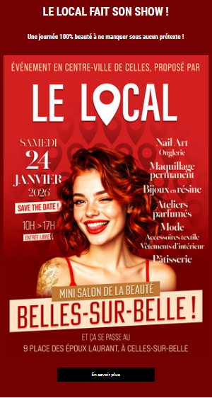 Au programme : - LE LOCAL FAIT SON SHOW : Le 24 janvier, premier mini salon dédié à la Beauté - LES PRODUCTEURS FONT L'ACTU : Les galettes des rois de la boulangerie Cornuault à Mougon (79)- ÇA BOUGE AU LOCAL : Nelly Guertin, Sophrologue certifiée de Celles-sur-Belle propose ses ateliers enfants et adultes au LOCAL - NOTRE ANNUAIRE S'ENRICHIT : SHOP TON BONHEUR rejoint l'annuaire, et portrait de NELLY GUERTIN