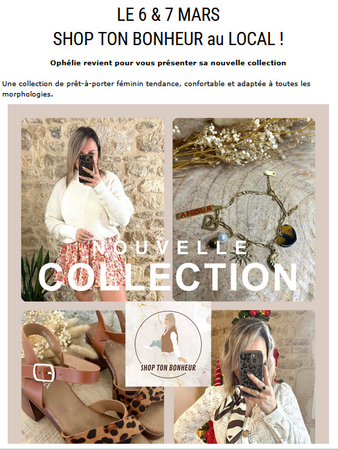 - LE 6 & 7 MARS SHOP TON BONHEUR AU LOCAL : Ophélie revient pour vous présenter sa nouvelle collection
