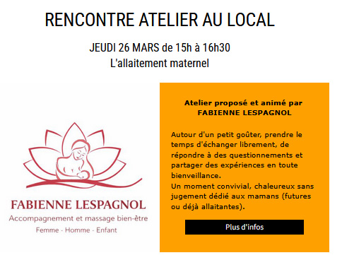 - RENCONTRE ATELIER AU LOCAL : JEUDI 26 MARS de 15h à 16h30 L'allaitement maternel avec Fabienne LESPAGNOL Voir la page de Fabienne