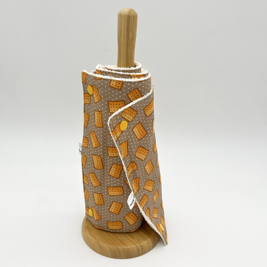 Le So'Malin : des carrés essuie-tout lavables qui s'attachent les uns avec les autres à l'aide de boutons pressions pour composer un rouleau.